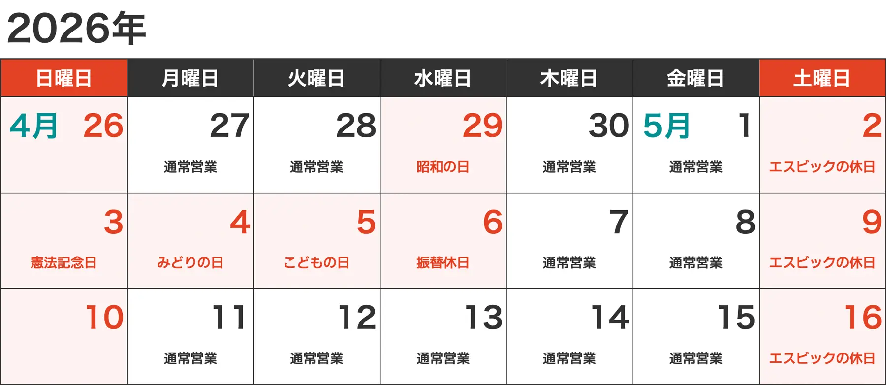 ゴールデンウィーク期間の休業日の御案内2026年