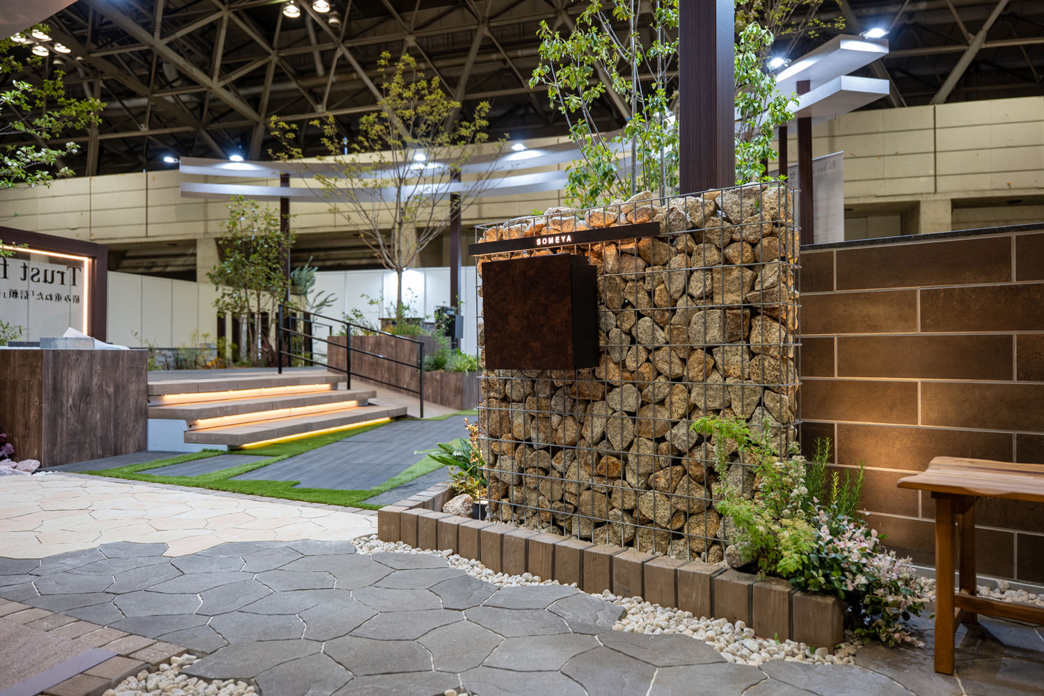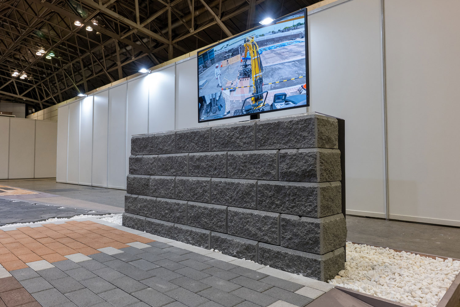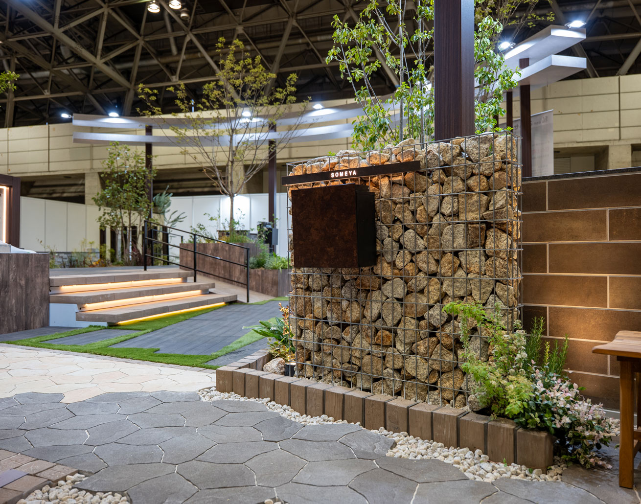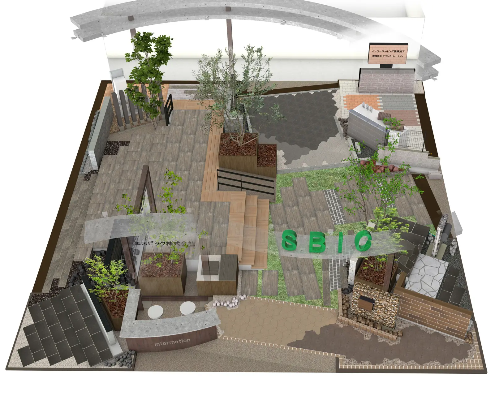 EXG2026に出展したエスビックブースのエリアマップです。 今年は、乱形インターロッキングをはじめ、木調製品や天然石の景石など、ナチュラルなデザインの外構アイテムを多数ご提案しています。 また、近年の労働力不足への対応として、施工の省力化と時短を実現する取り組みも紹介。インターロッキングブロックの機械施工や、新工法の嵌合コンクリートブロック「アイフィット」を展示しました。