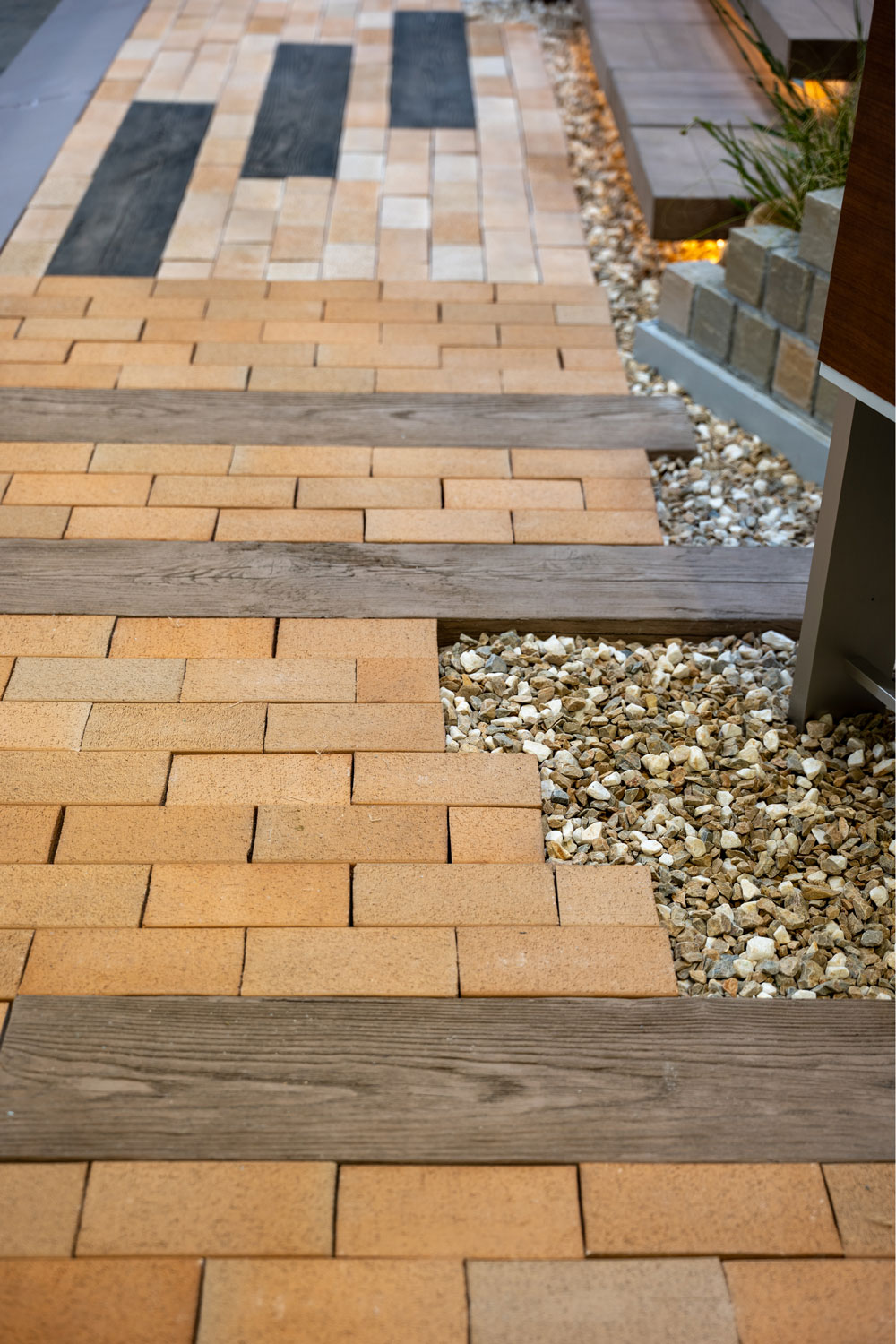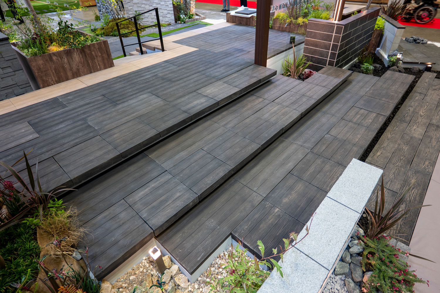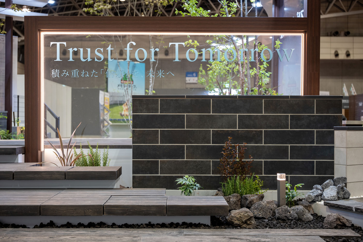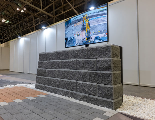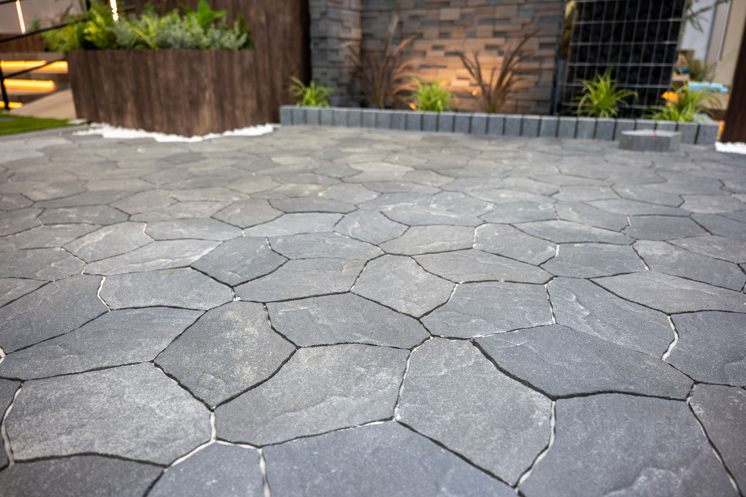 EXG2026に出展したエスビックブースのエリアマップです。 今年は、乱形インターロッキングをはじめ、木調製品や天然石の景石など、ナチュラルなデザインの外構アイテムを多数ご提案しています。 また、近年の労働力不足への対応として、施工の省力化と時短を実現する取り組みも紹介。インターロッキングブロックの機械施工や、新工法の嵌合コンクリートブロック「アイフィット」を展示しました。